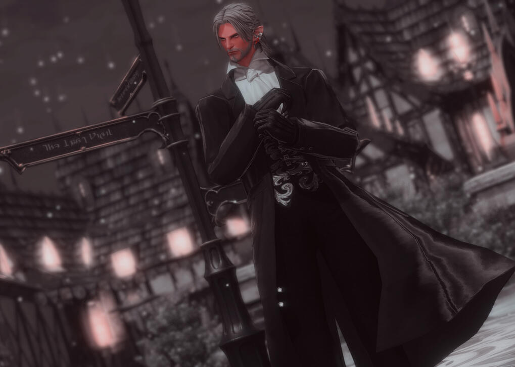 APPEARANCE Standing at an imposing 7 fulms and 1 ilm, his presence commands attention long before he speaks. His silver-grey hair frames sharp, aristocratic features and an olive-yellow gaze that seems to measure everything it falls upon. A faint scar traces the edge of his jaw, a mark of experience earned through countless travels. Beneath the tailored armor and fine detailing lies a frame honed by years of battle. Muscle shaped by the demanding discipline of a gunbreaker’s craft, every motion carrying the quiet power of one well-versed in both strength and precision.